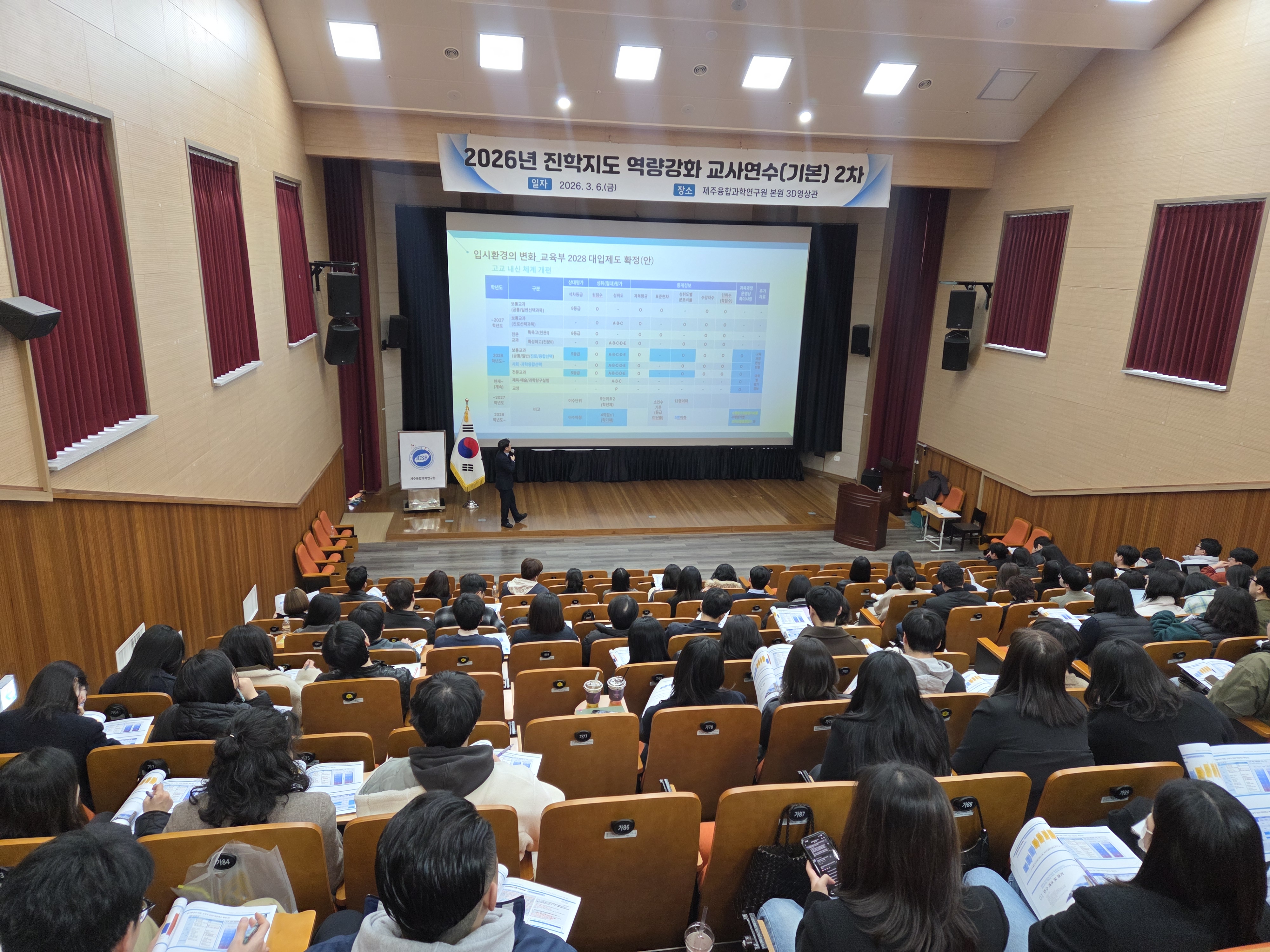 □ 프로그램: 2026년 진학지도 역량강화 교사연수 (기본) 2차 □ 운영일시: 2026.3.6.(금) □ 운영장소: 제주융합과학연구원 3D영상관 □ 운영대상: 도내 고등학교 1학년, 2학년 교사 등 □ 운영내용: 2028 대입제도 개편과 고교의 대응 전략